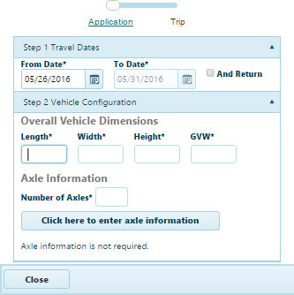 Open the Application page to create new applications, find existing applications or permits, and view messages about the system. If you need to test a trip, click the Route Evaluation Application tool link.