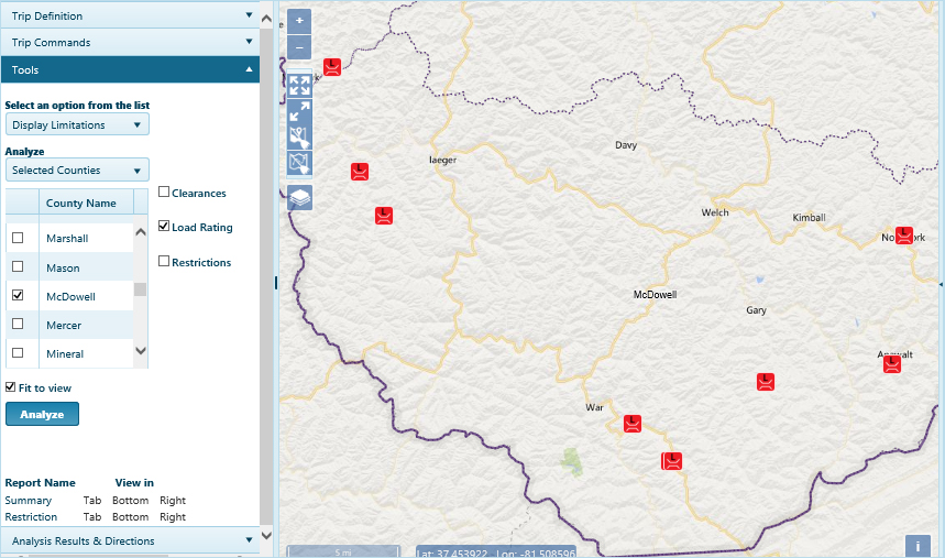 Use the Display Limitations function to search the database for Clearances, Load Rating tolerances, and/or Restrictions and then to present the results of that search on the map.