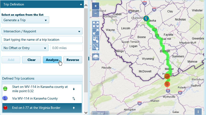 Both the Map and the Defined Trip Locations box display the stages of your trip as you enter them. Click the Analyze button to have the system evaluate your route.