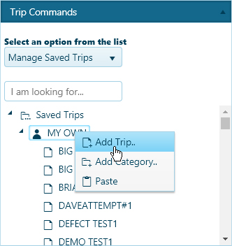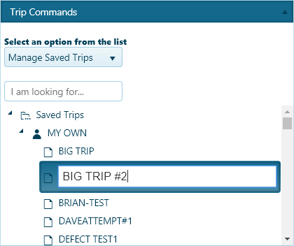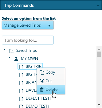 With an application open to the Trip page, access the Trip Commands pane and choose Manage Saved Trips from the drop-down.