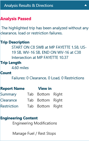 The Analysis Results & Direction pane will show a Pass/Fail message, a Trip Description, and the Trip Length.